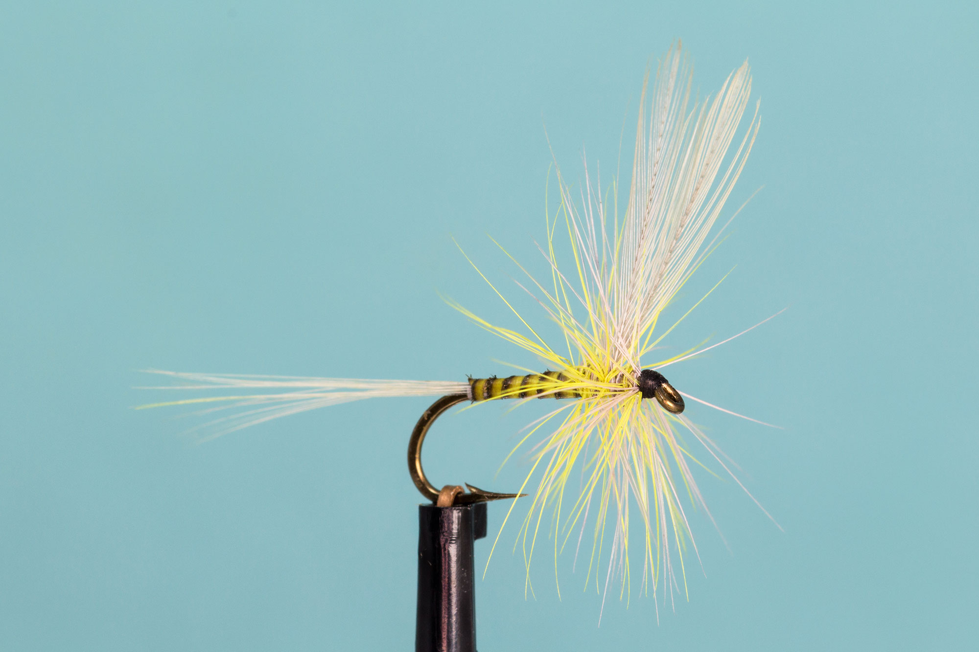 Ali – In punta di hackle di gallo grigio chiaro, montate e fissate orizzontali e perpendicolari al gambo dell’amo (spent)