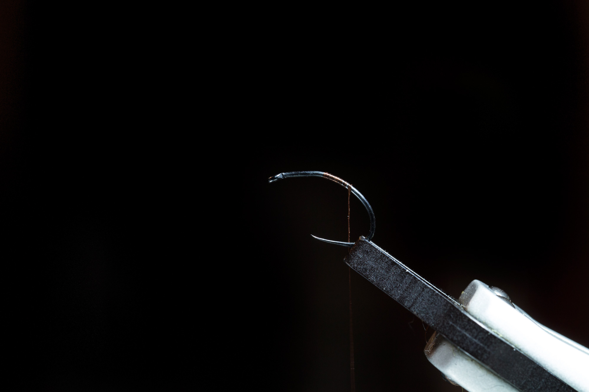 Posizioniamo sul morsetto un amo grub di grandezza compresa tra il 14 e il 10 a seconda delle dimensioni volute ed iniziamo legando il filo di montaggio.