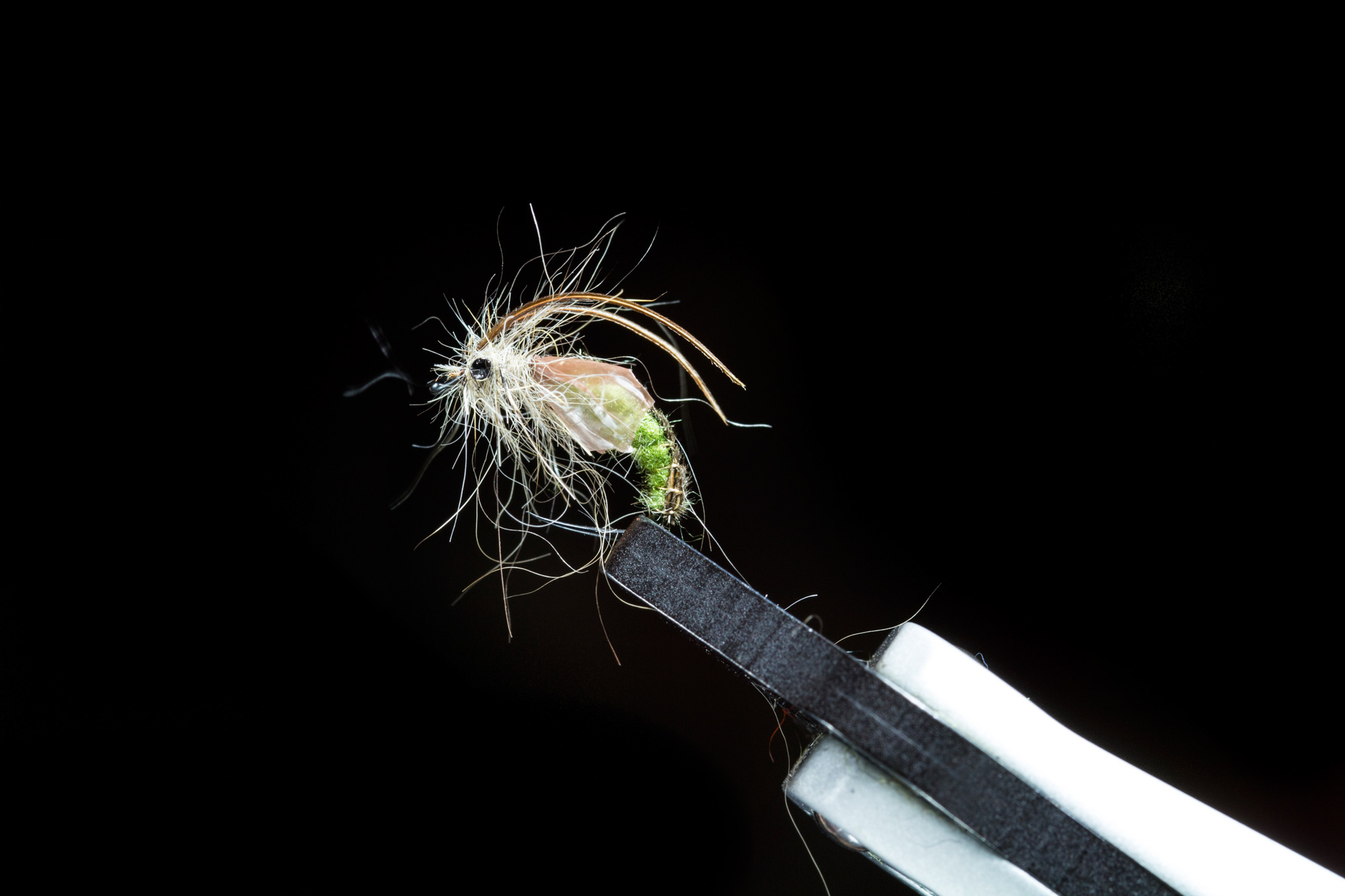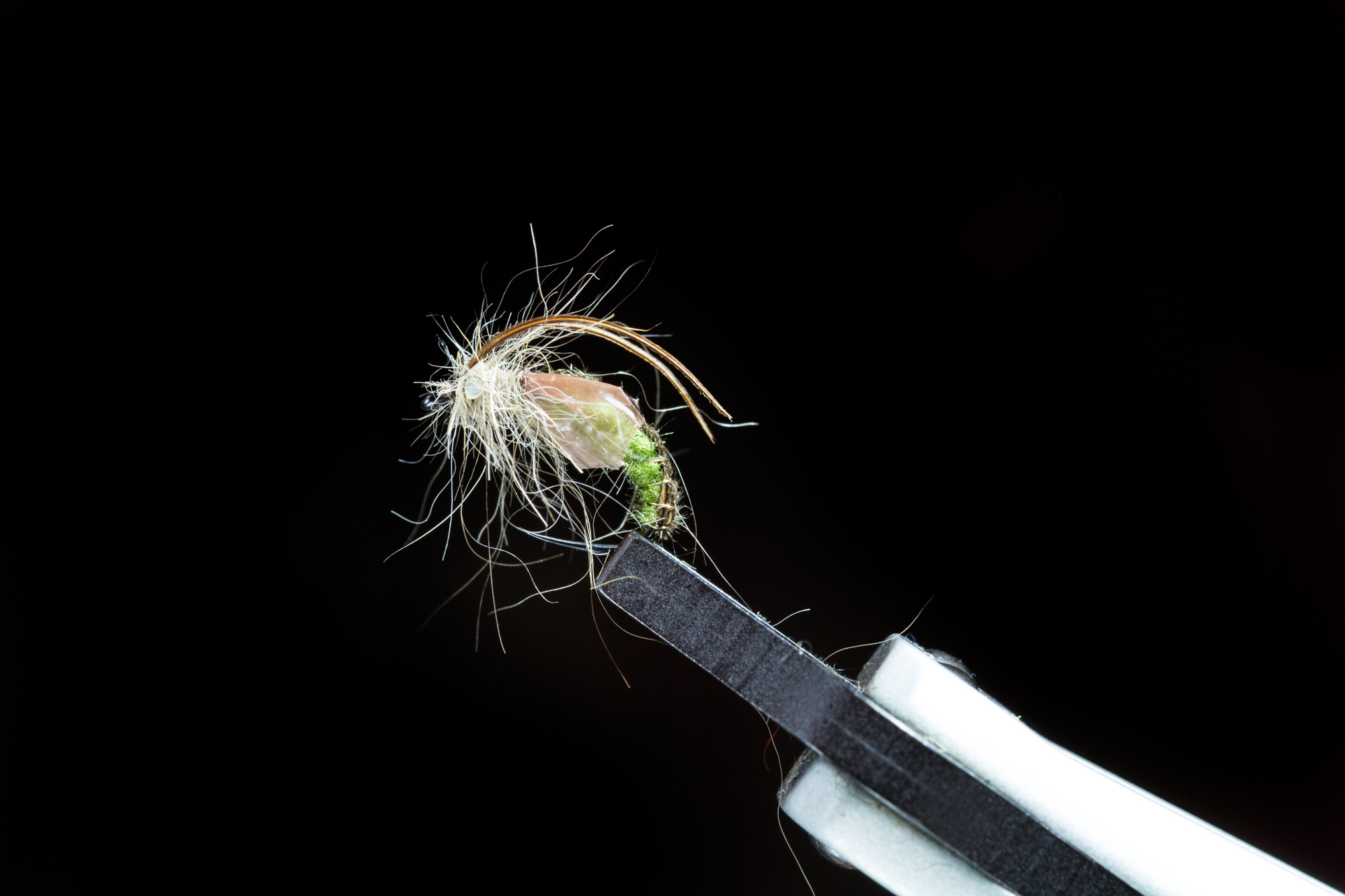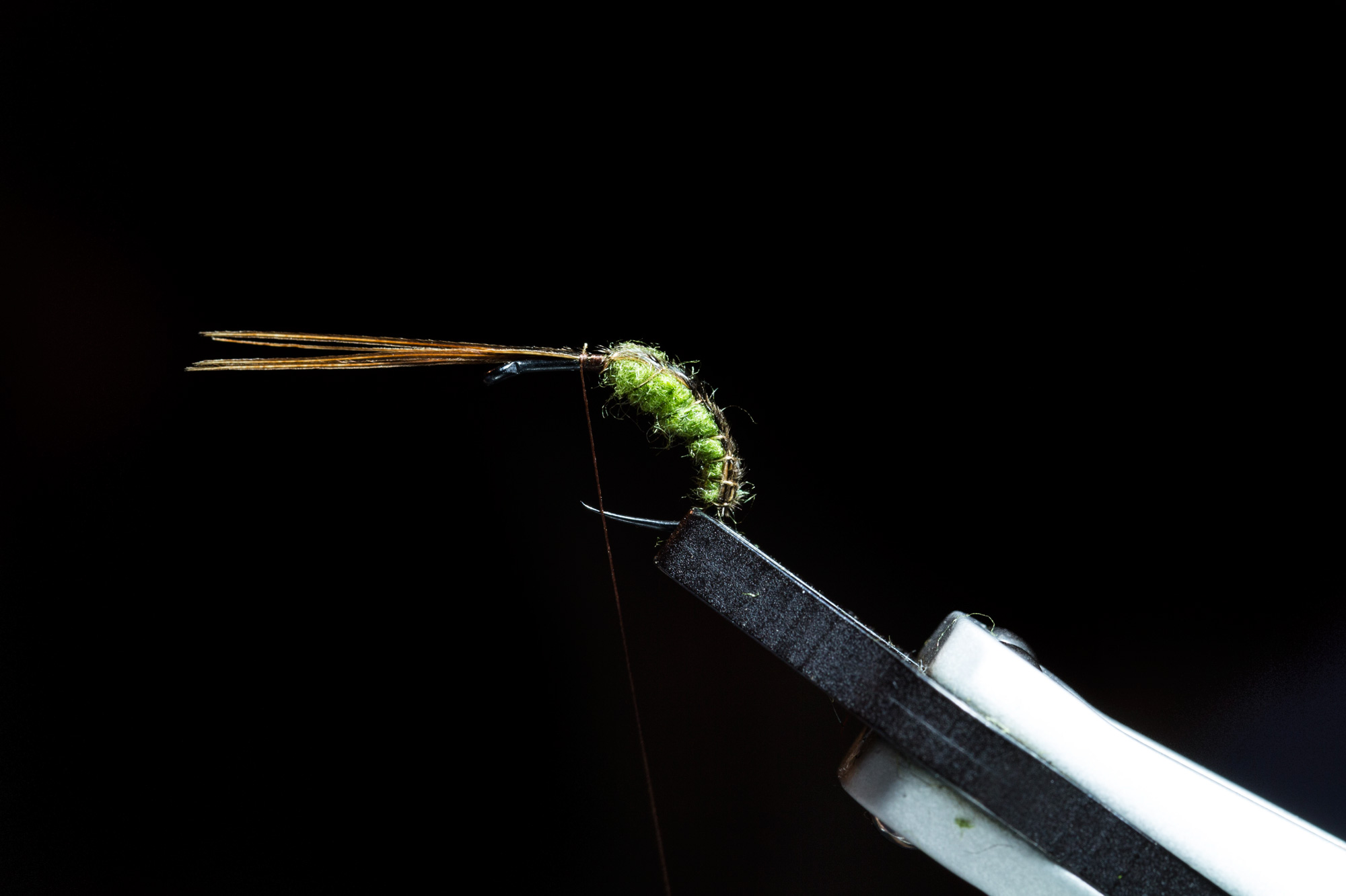Questo artificiale vuole imitare una pupa di tricottero di tonalità verde chiaro (per es. Rhyacophilidae) che nuota verso la superficie del fiume dove ultimerà la metamorfosi.