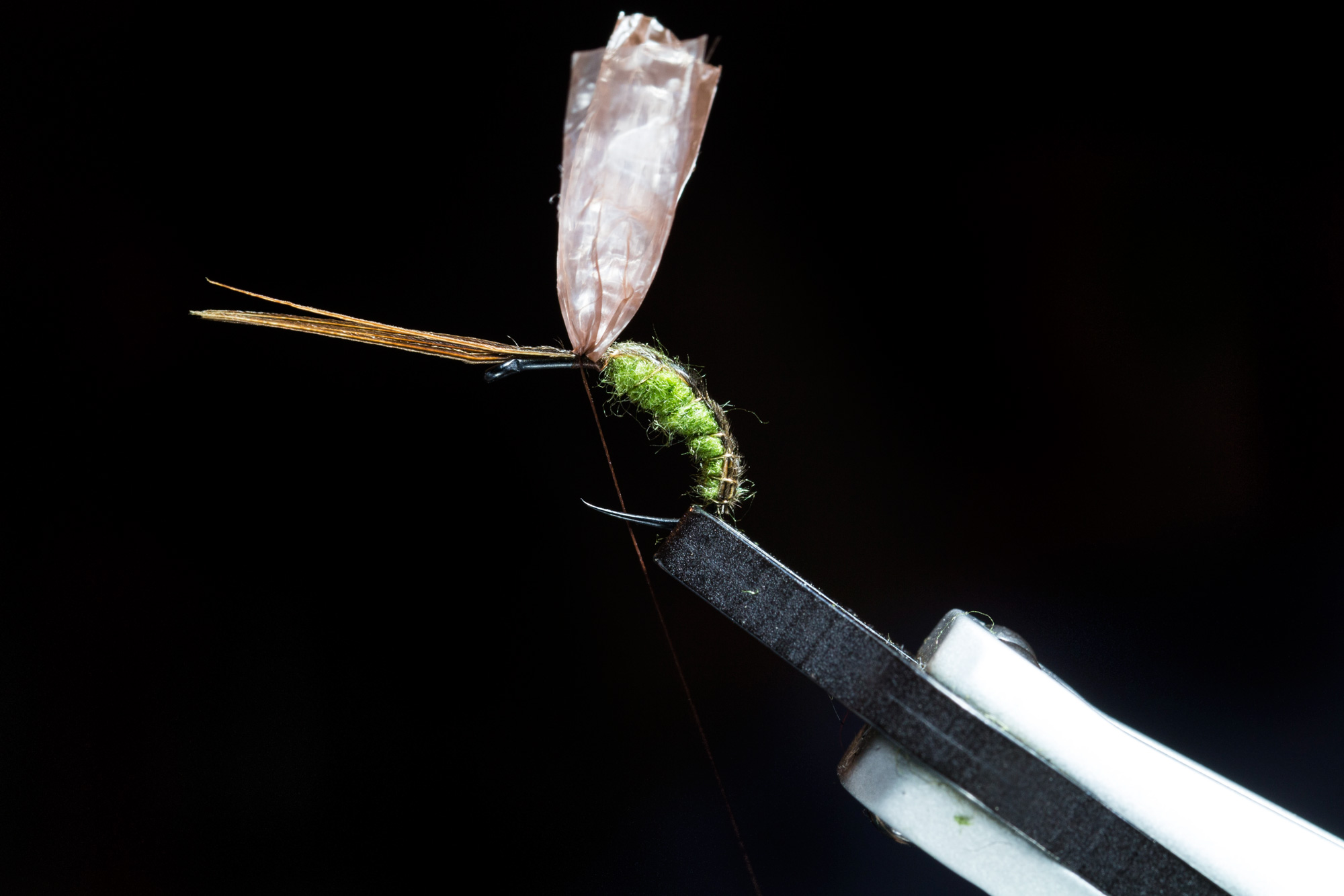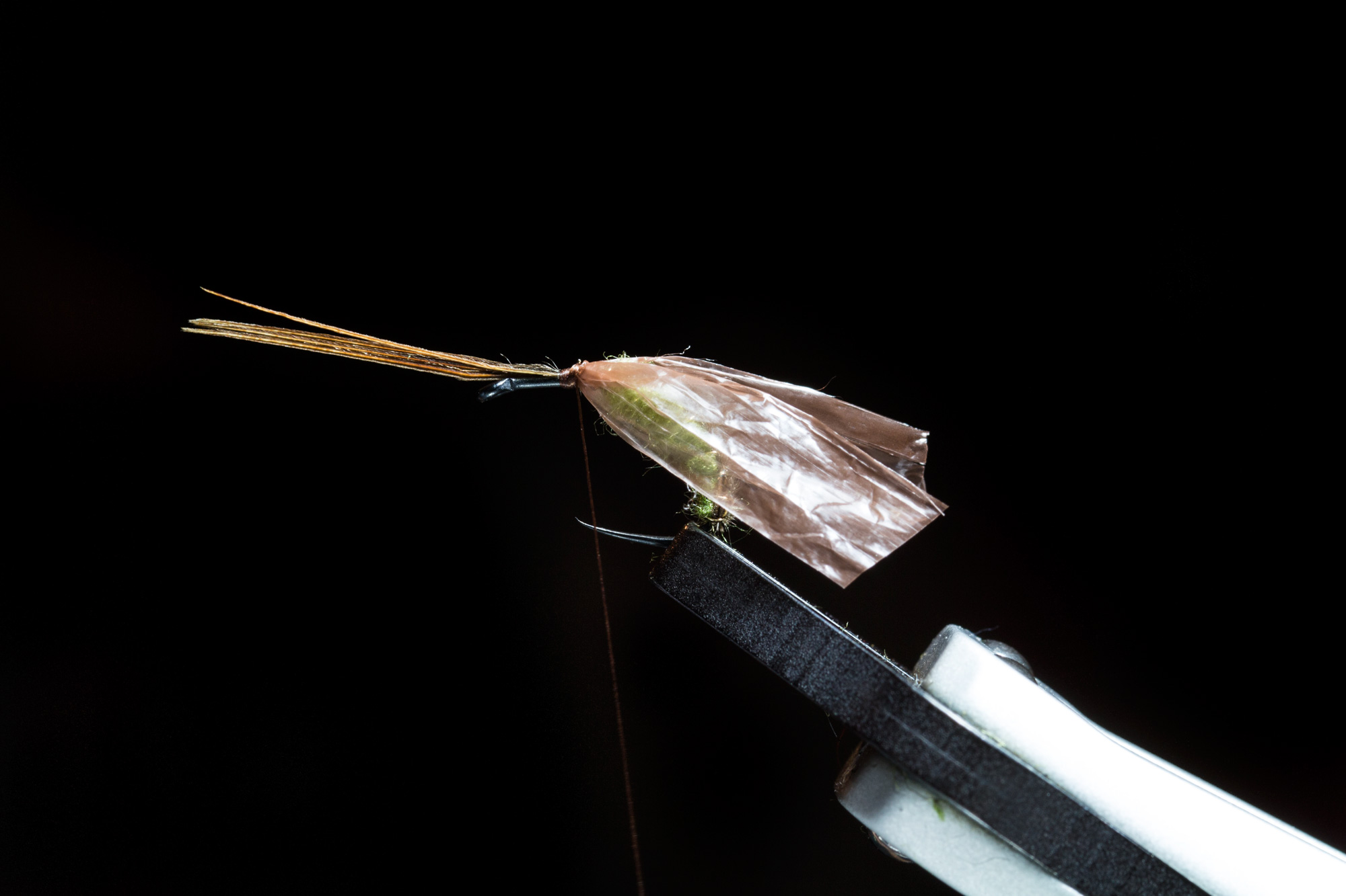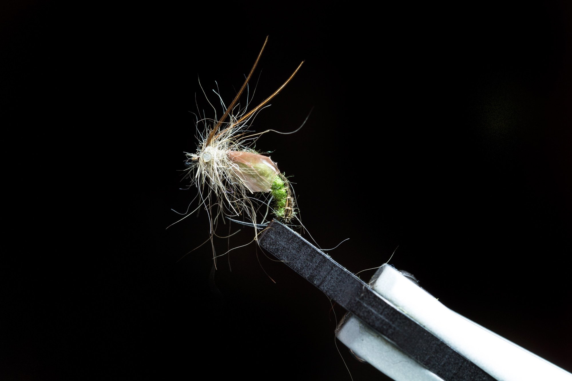 Questo artificiale vuole imitare una pupa di tricottero di tonalità verde chiaro (per es. Rhyacophilidae) che nuota verso la superficie del fiume dove ultimerà la metamorfosi.