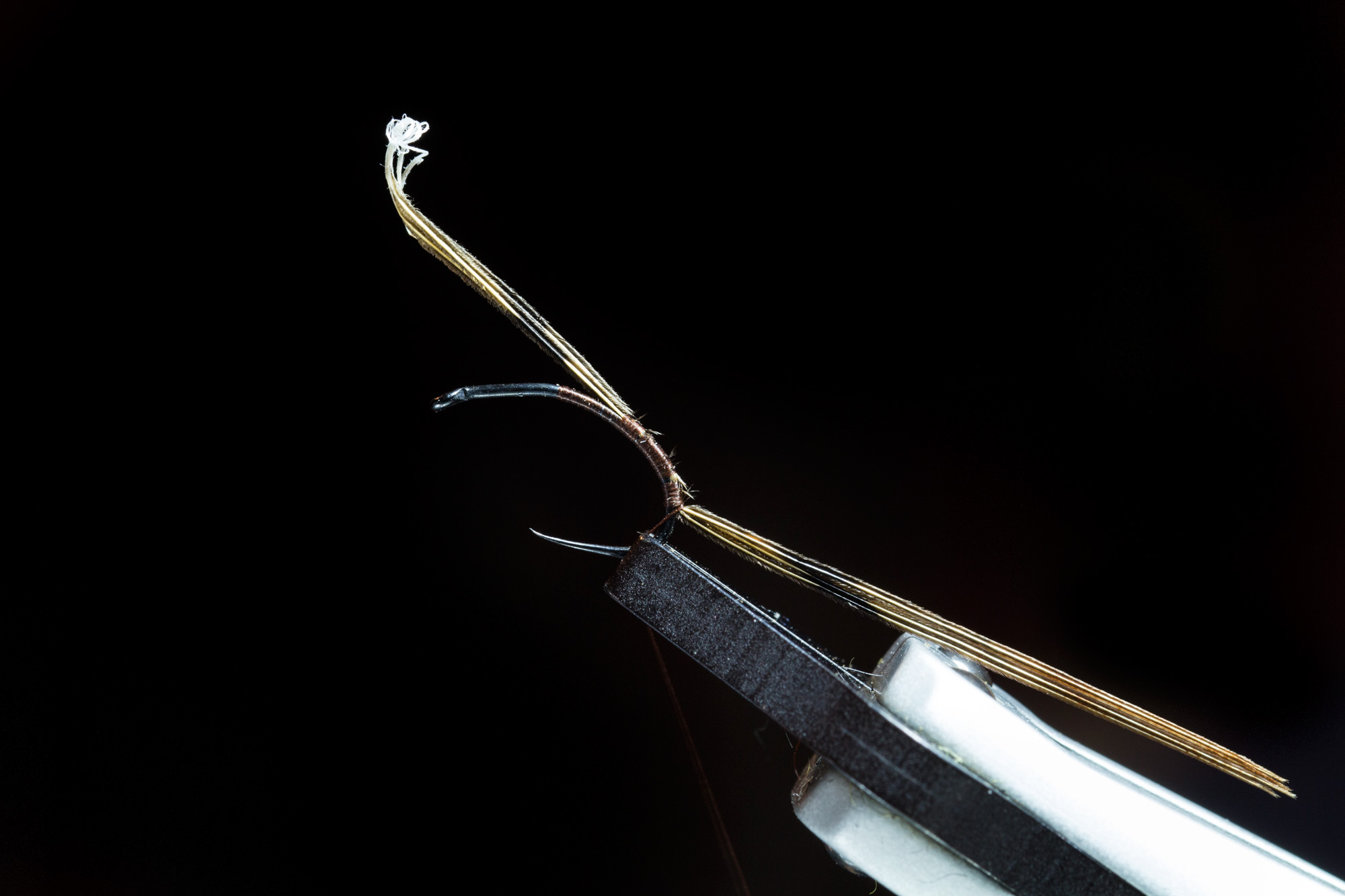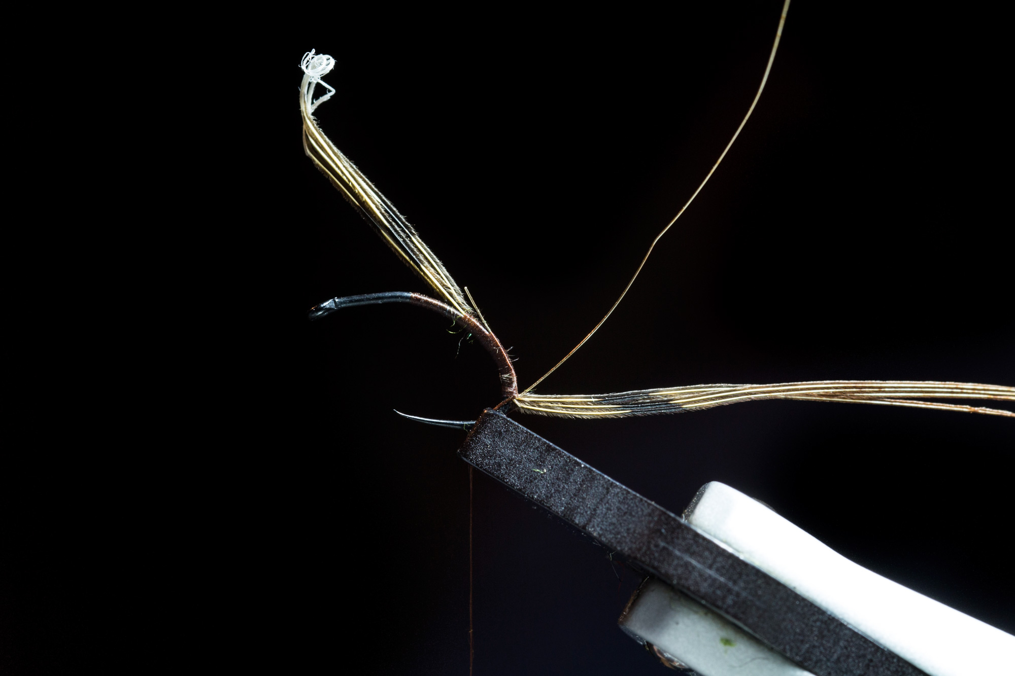 Prendiamo 4 fibre di coda di fagiano maschio, pareggiamole e fissiamole in coda all’artificiale, lasciandole lunghe 2 volte e mezzo la misura del gambo dell’amo.