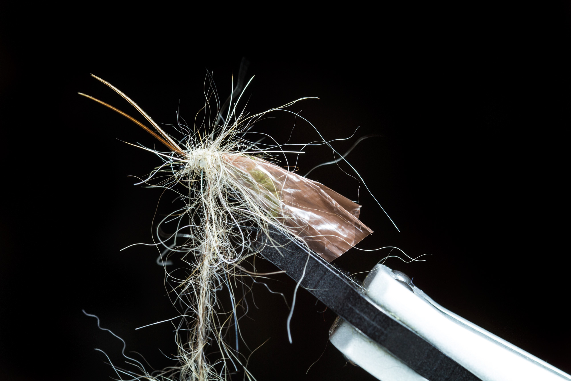 Creiamo un cordoncino di pelo naturale lasciandolo vaporoso e avvolgiamolo a creare il torace e le zampette dell’artificiale.
