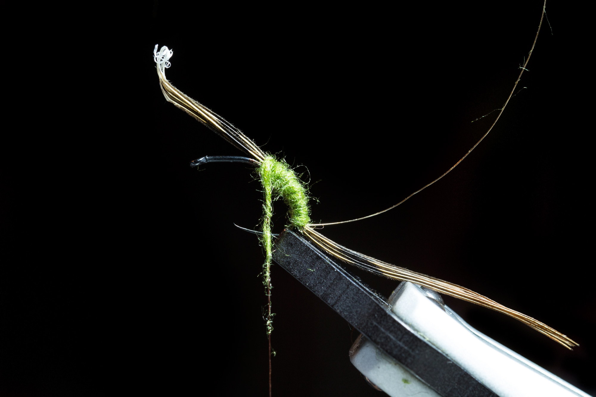 Andiamo a creare l’addome con un dubbing ultrafine color verde mela, possibilmente chiaro, in modo che una volta bagnato risulterà della tonalità giusta.