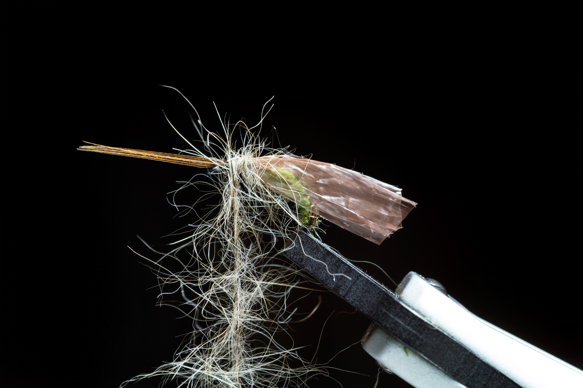 Fissiamo ora, perpendicolarmente all’amo, una striscia di rafia sintetica di colore scuro ad imitare gli astucci alari, avvolgendo a 8 il filo di montaggio.